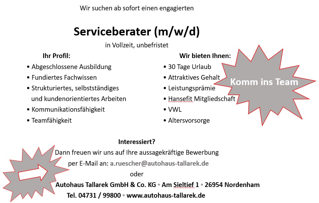Entdecken Sie das Autohaus Tallarek – Ihre Adresse für persönliche Beratung, hochwertige Fahrzeuge und exzellenten Service in Nordenham. Bei uns stehen Ihre Bedürfnisse im Mittelpunkt: vom ersten Gespräch bis zur langfristigen Betreuung.